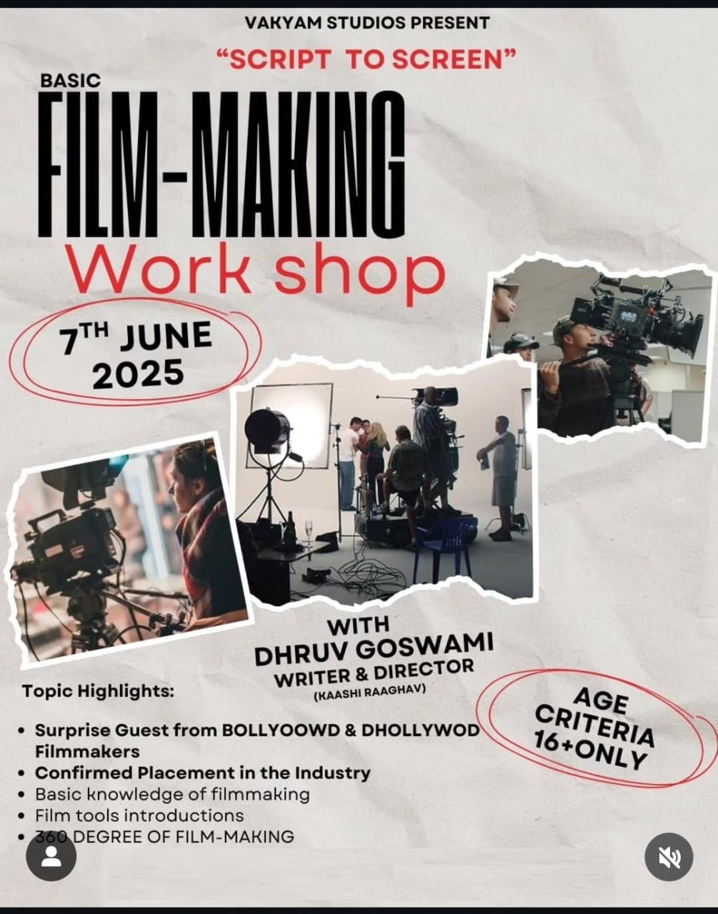અમદાવાદ, મે 2025 : વાક્યમ સ્ટુડિયોઝ દ્વારા એક અનોખી અને શ્રેષ્ઠ તકો આપવા માટે તૈયાર થયેલ બેઝિક ફિલ્મમેકિંગ વર્કશોપ “સ્ક્રિપ્ટ ટુ સ્ક્રીન” 7 જૂન, 2025 ના રોજ યોજાવાનો છે. 16 વર્ષ કે તેથી વધુ વયના લોકો માટે ઉદ્દેશિત આ વર્કશોપનું માર્ગદર્શન જાણીતા લેખક અને નિર્દેશક ધ્રુવ ગોસ્વામી કરશે, જેમણે કાશી રાઘવ જેવા પ્રશંસિત પ્રોજેક્ટ પર કાર્ય કર્યું છે. આ વર્કશોપ ફિલ્મમેકિંગની શરૂઆતથી અંત સુધીની 360 ડિગ્રી સમજ આપે તેવી રીતે રચાયેલ છે – જેમાં સ્ક્રિપ્ટ લખવાથી લઈ પ્રોડક્શન સુધીની દરેક પધ્ધતિને આવરી લેવામાં આવી છે.