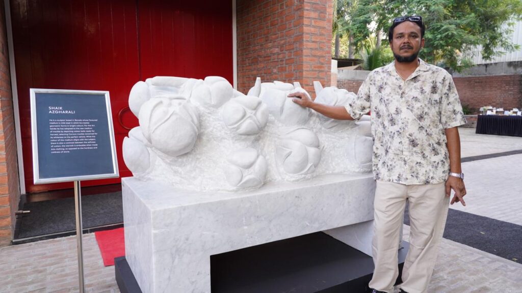 શૈક એક શિલ્પકાર છે અને જેની પ્રેક્ટિસ લેબર, મટીરીયલ અને સ્વરૂપ વચ્ચેના સંબંધને ફરીથી વ્યાખ્યાયિત કરે છે. ‘આઈ એમ કોટન’ એક આકર્ષક વિસંગતિ રજૂ કરે છે – ક્ષણભંગુર રેશમને એન્ડ્યોરિંગ સ્ટોનમાં રૂપાંતરિત કરવાની. શૈક કરારા એક્સ્ટ્રા માર્બલને, જે રેપુનરુજ્જીવન શુદ્ધતા અને મોડર્નિસ્ટ ઔપચારિકતાનું ઐતિહાસિક માધ્યમ રહ્યું છે, તેને હાથથી તોડેલા કપાસના ગાંઠ કે કોમળ કોથળાની ભાતીગળ અતિભવ્ય આકારોમાં ગઢે છે. તેની સપાટી એવી રીતે કામ કરવામાં આવી છે કે તે કુદરતી અસમાનતાને જાળવી રાખે છે, જે કોમળતા, ભારરહિતતા અને શ્વાસ સુધીની અનુભૂતિ જગાવે છે. છતાં, અહીંનો વિવાદ માળખાકીય છે – સ્પર્શનો ભાસ ઉગાડેલો નથી, તે તો કોતરેલો છે; આ કોમળતા તો ટનના વજનમાં સંવાયેલું એક કલ્પિત ભ્રમ છે. આ કૃતિ ભૌતિક શ્રમ, કોમોડિટી પરિભ્રમણ અને સ્પર્શના સૌંદર્ય શાસ્ત્ર પર પોસ્ટકોલોનિયલ ધ્યાન બની જાય છે. તે રશેલ વ્હાઇટરીડનીના નેગેટિવ સ્પેસ અને ડોરિસ સાલ્સેડોની સ્મૃતિ-વસ્તુઓને યાદ અપાવે છે, જ્યાં હાજરી મારફતે ગેરહાજરીને જગાવવામાં આવે છે. ‘આઈ એમ કોટન’ એક સાથે અર્પણ અને અવરોધ બનીને ઉભું રહે છે – જે ધીમું થવા મજબૂર કરે છે અને સ્પર્શની કલ્પના માટે આમંત્રણ આપે છે.